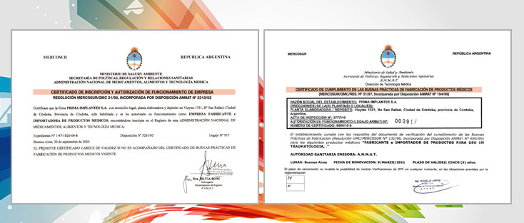 La fábrica de PRIMA IMPLANTES S.A. en la ciudad de Córdoba, se encuentra habilitada como Empresa Fabricante e Importadora de Productos Médicos, por la Administración Nacional de MÉDICAmentos, Alimentos y Tecnología Médica (A.N.M.A.T.), según Disposición 2319/02, cumplimentando las Buenas Prácticas de Fabricación de Productos Médicos dispuestas en la Disposición 194/99. Actualmente, nuestra empresa cumple con el Reglamento Técnico Mercosur de Buenas Prácticas de Fabricación de Productos Médicos y Productos para Diagnostico de uso in vitro incorporadas en la Disposición 3266/13. Además cuenta con la habilitación como Laboratorio de Productos Médicos emitida por la Dirección de Jurisdicción Farmacia del Ministerio de Salud de la Provincia de Córdoba.